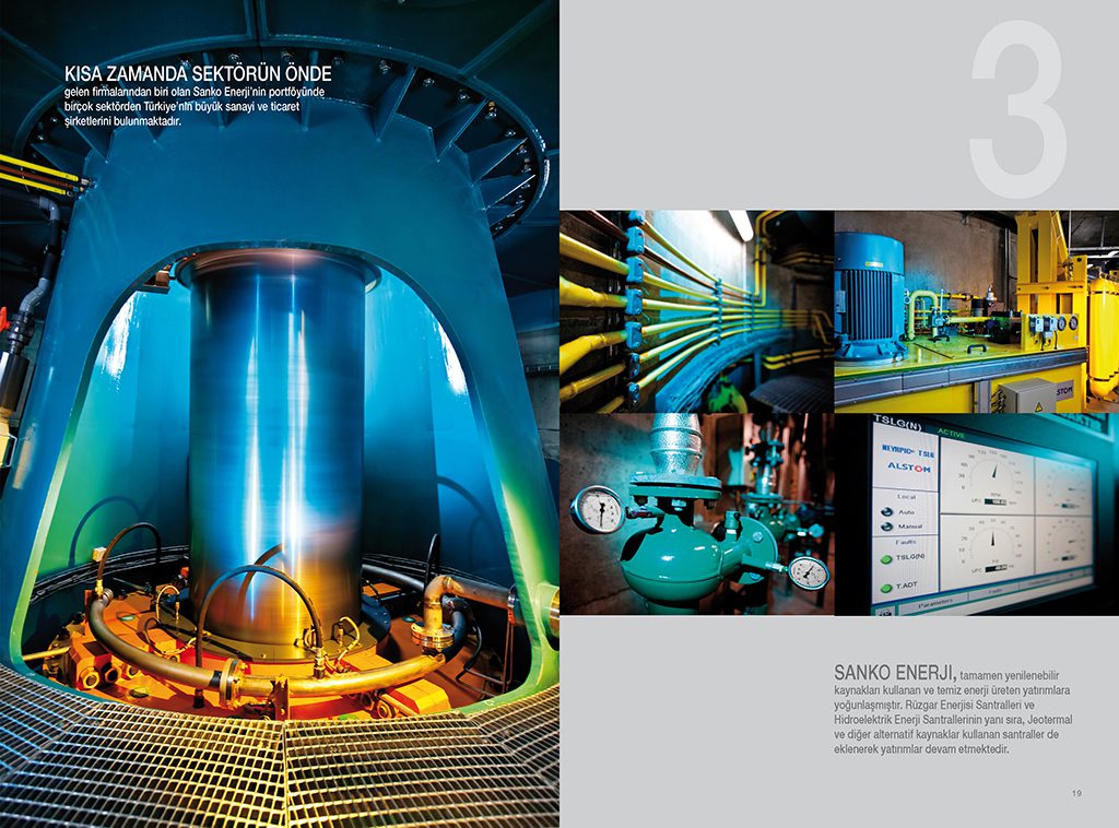 Proposta grafica per la brochure di presentazione degli investimenti nel settore energetico di Sanko (holding turca). Come comunicare in modo chiaro e gradevole i dati degli investimenti aziendali.